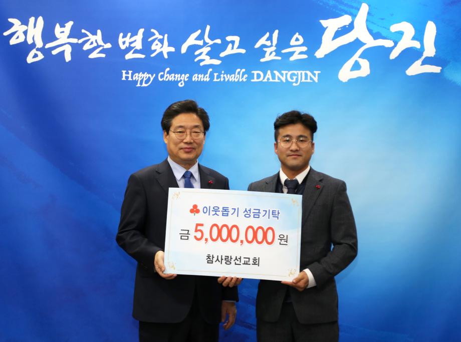 크리스마스를 사흘 앞둔 지난 22일 당진의 참사랑선교회(목사 김호)와 행담도개발(주)(대표이사 안동준)은 당진시청을 방문해 어려운 이웃을 위해 써 달라며 각각 이웃돕기 성금 500만 원을 기탁했다.