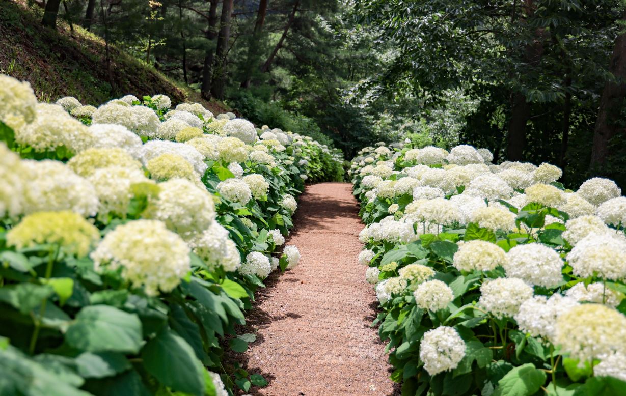 삼선산 수목원은 수국이 만개해 방문객들이 끊이지 않고 있다. 애나벨 품종이 아름다운 수국 산책길을 만들고 있으며, 앞으로 열흘 정도 만개한 수국을 즐길 수 있다. 유아숲체험원과 수목원 곳곳에 다양한 수국과 원추리도 감상할 수 있다.