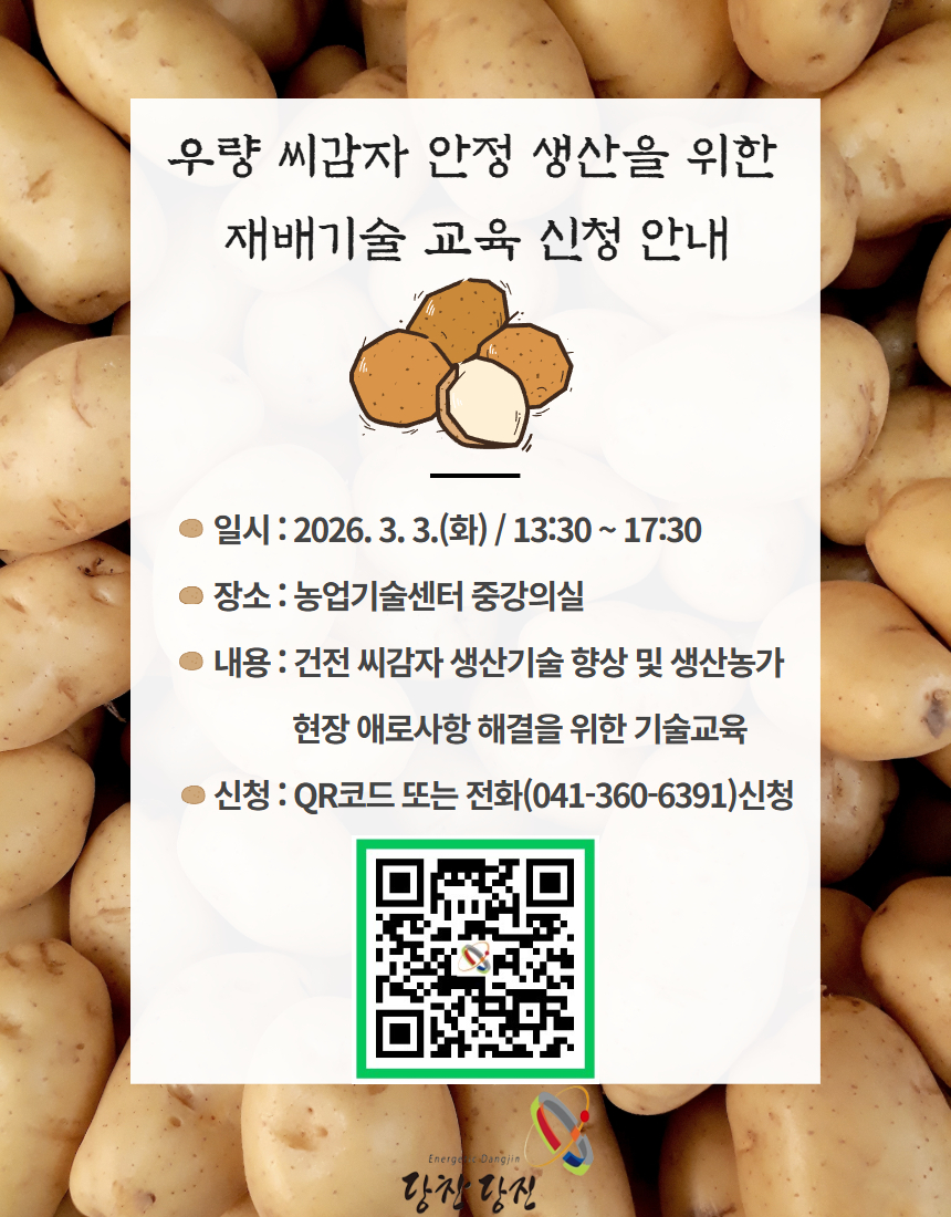 당진시(시장 오성환)는 오는 3월 3일 오후 1시 30분 당진시농업기술센터 중강의실에서 씨감자 추백 재배 농가 및 교육 희망자 50여 명을 대상으로 ‘우량 씨감자 안정 생산을 위한 재배기술 교육’을 실시한다고 24일 밝혔다.