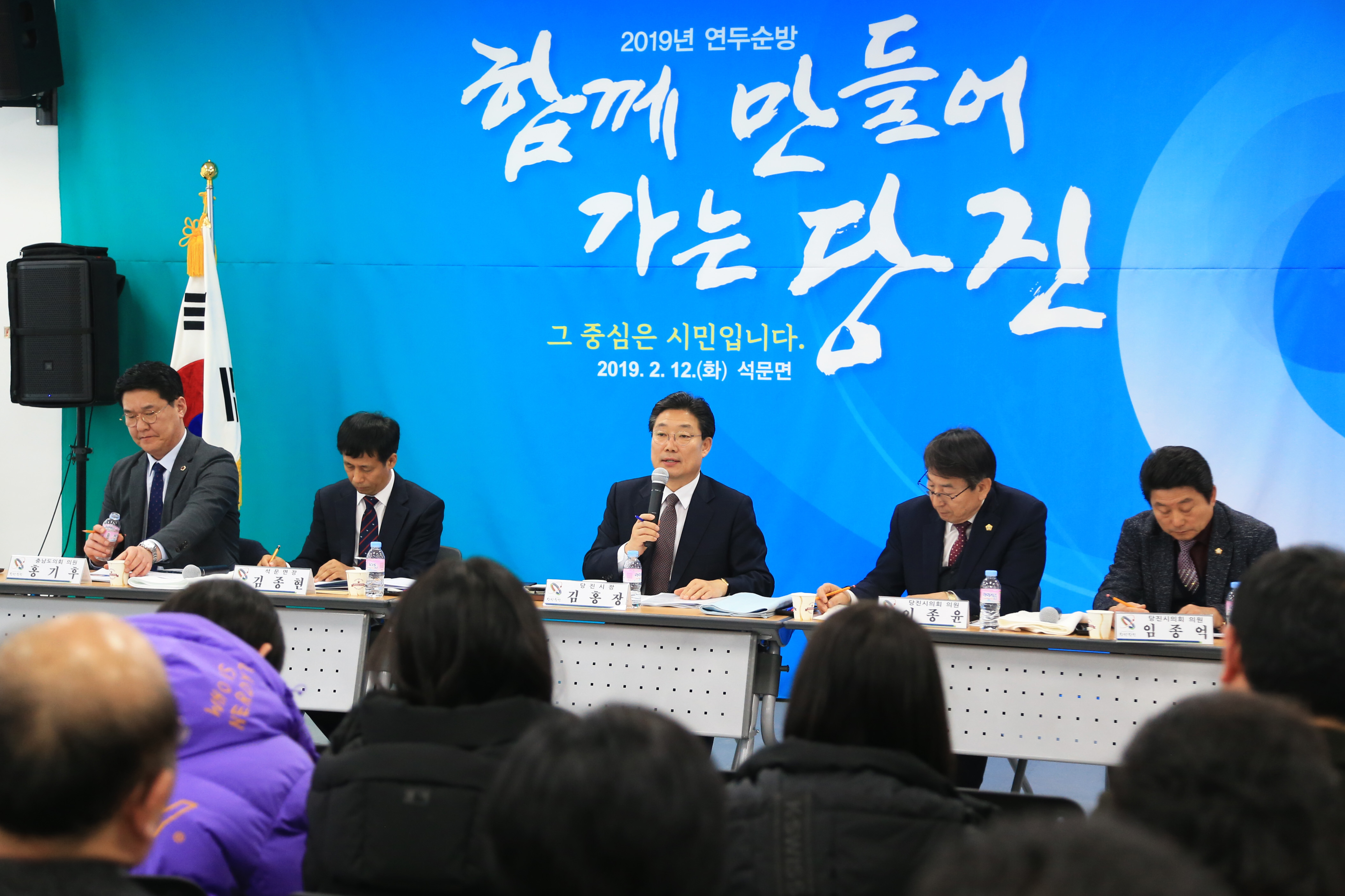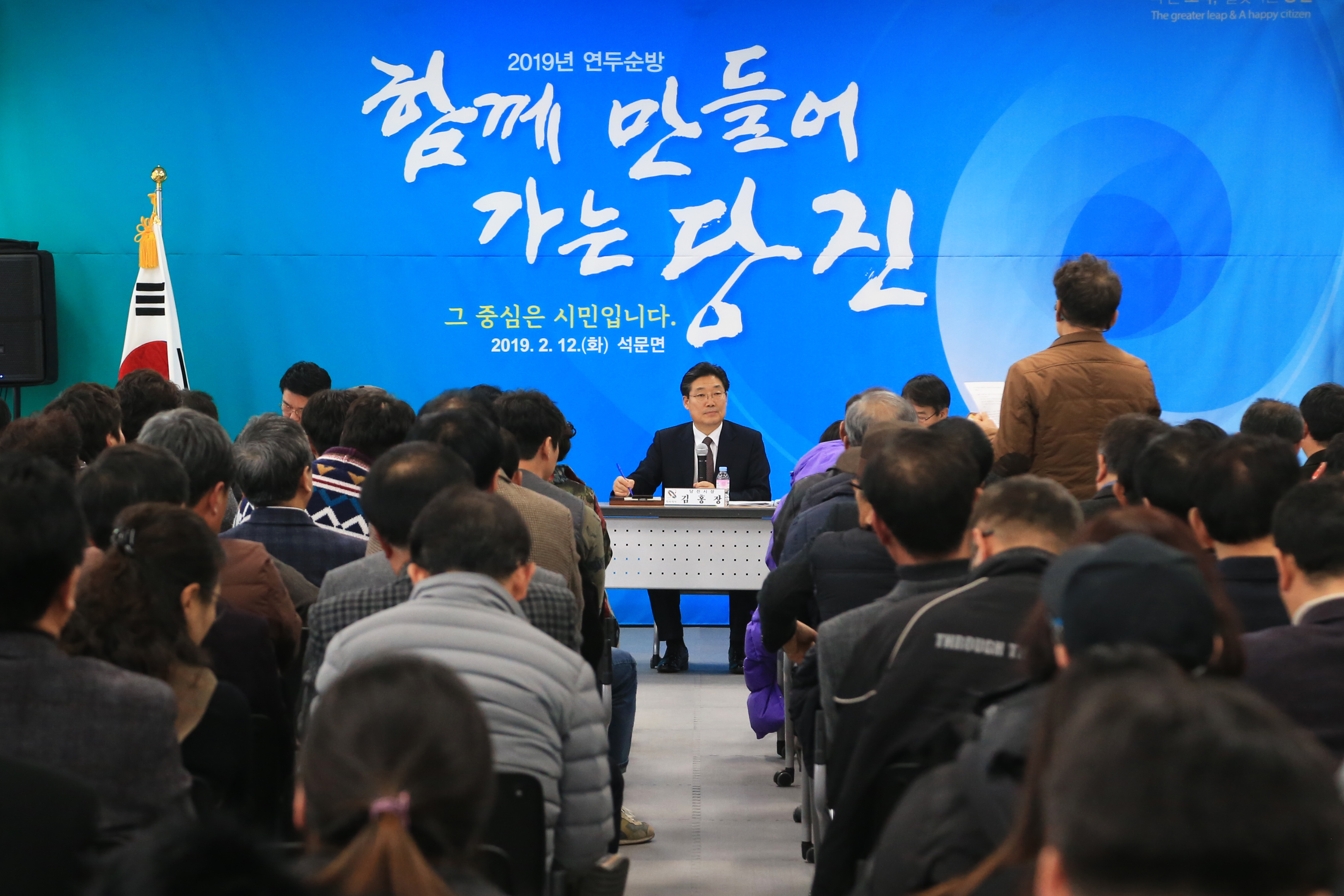 김홍장 당진시장이 12일 오후 3시 석문문화스포츠센터에서 진행된 석문면 연두순방에서 올해 시정 운영방향을 밝히며 지속가능 성장으로 더 큰 도약을 이끌어 내겠다는 생각을 밝혔다.