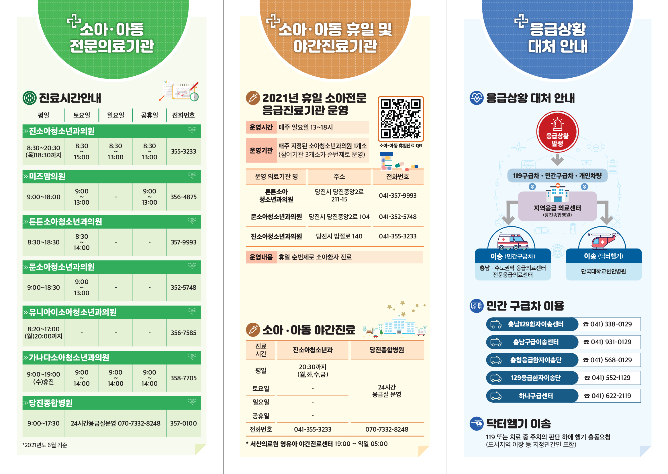 한편 소아 자녀의 휴일 응급상황 시 이용할 수 있는 종일진료 의료기관 부재로 겪는 어려움을 해결하기 위해 지역 소아청소년과와 협력해 일요일 지정 소아전문진료기관을 운영하고 있으며 일정별 지정의료기관은 당진시보건소 홈페이지 공지사항에서 확인할 수 있다.