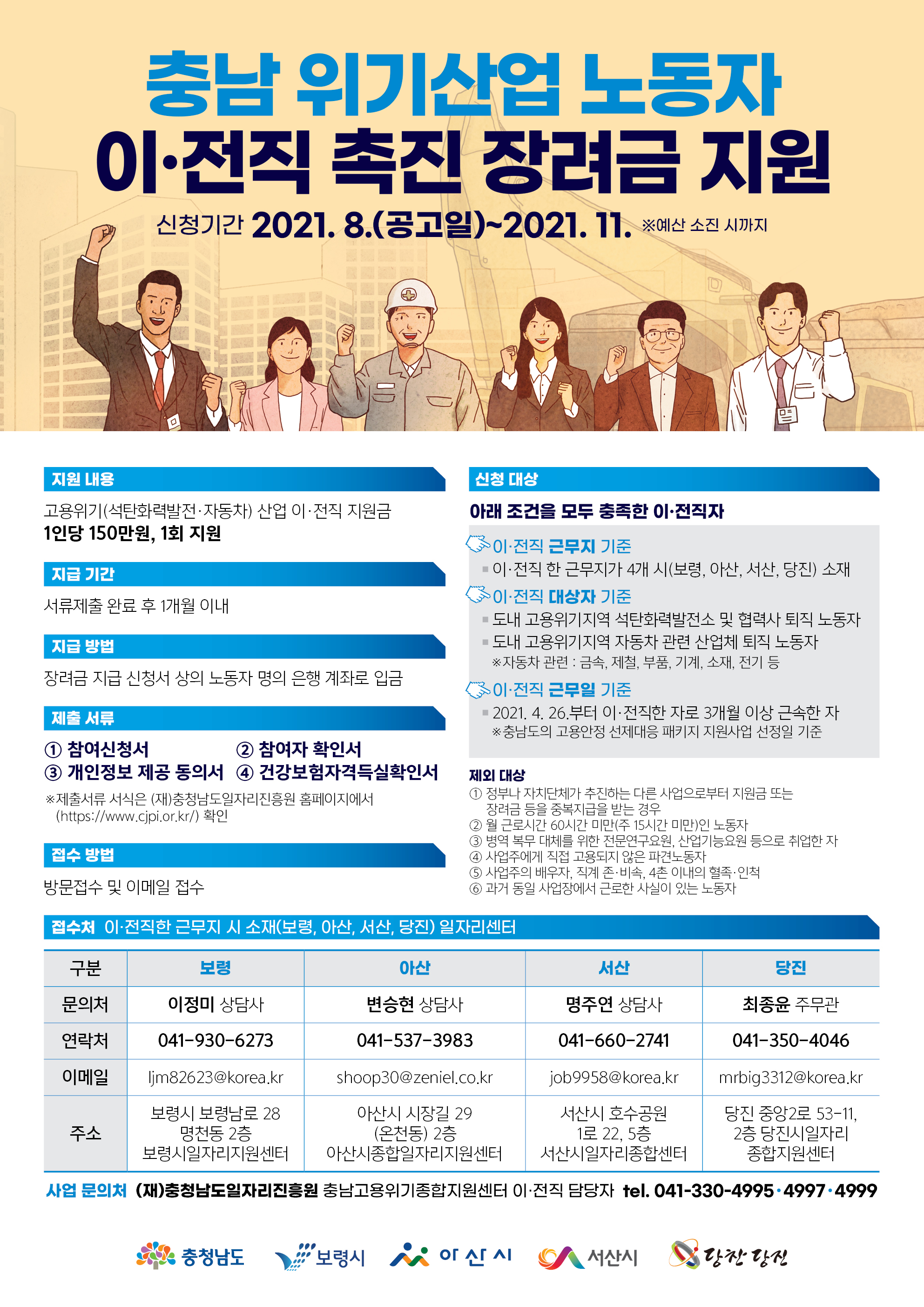 당진시가 지역 내 위기 노동자의 안정적 생활을 지원하고자 『충남 위기산업 노동자 이·전직 장려금 지원 사업』 대상자를 모집한다.