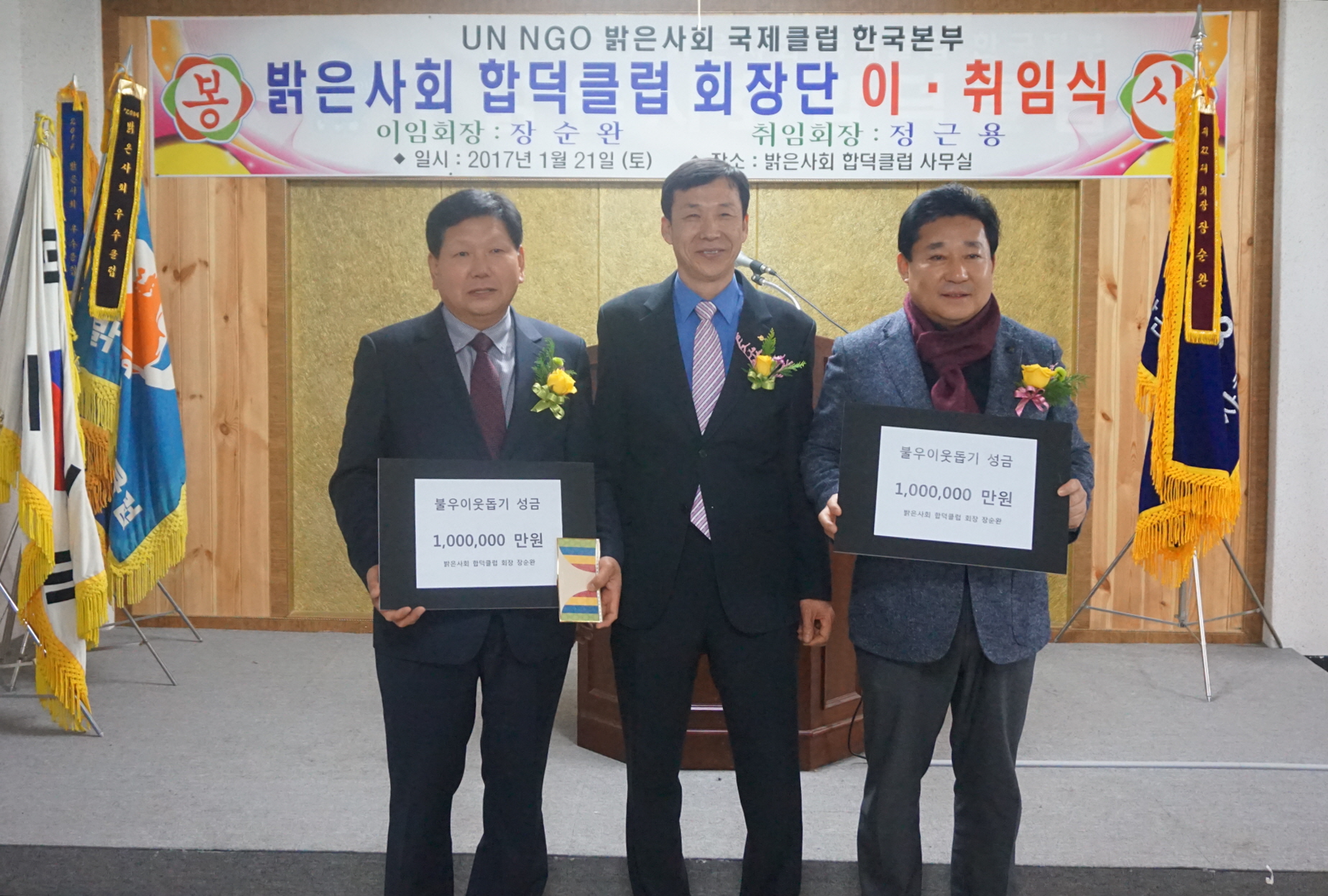 밝은사회 합덕클럽(회장 : 정근용)이 지난 21일 있었던 이취임식에서 합덕·우강지역 어려운 이웃에게 각각 100만원의 기부금을 지원하였다.