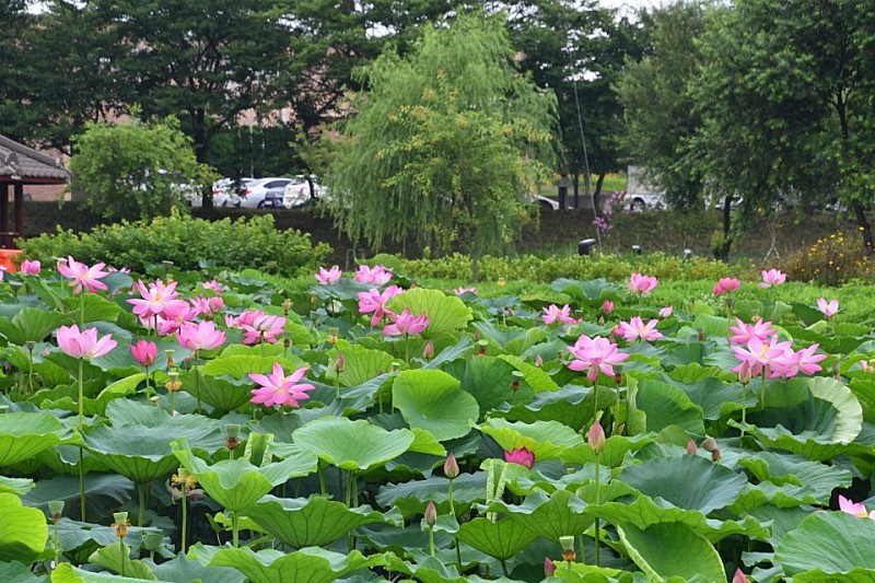 지난겨울에는 큰 고니 떼가 몰려와 아름다운 모습을 보여주었는데 지금은 그 자리에 연꽃이 피어났습니다. 홍련, 황련, 백련 등과 각종 수련과 수생식물들이 꽃을 피워 아름다운 모습을 보여주고 있습니다. 그리고 박물관 오른쪽으로는 농가주택이 있고 그 앞에 피어난 백일홍과 잘 어우러집니다. 근처에 작은 연못과 수리 기구들도 있어 함께 돌아보면 좋습니다.