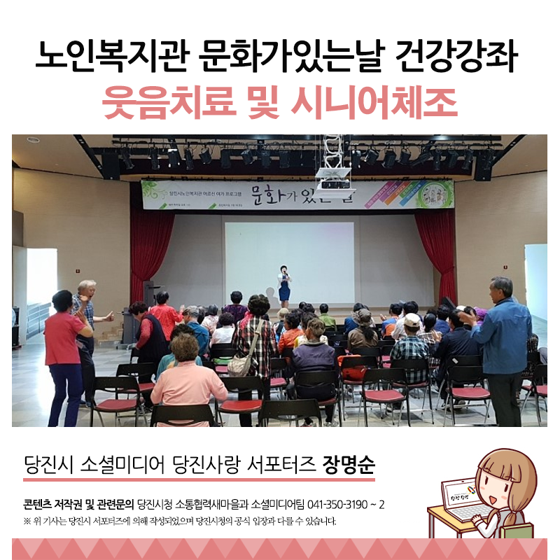 노인복지관에서 주최하는 문화가있는날 건강강좌 취재했습니다. 이번엔 "웃음치료 및 시니어체조" 입니다.