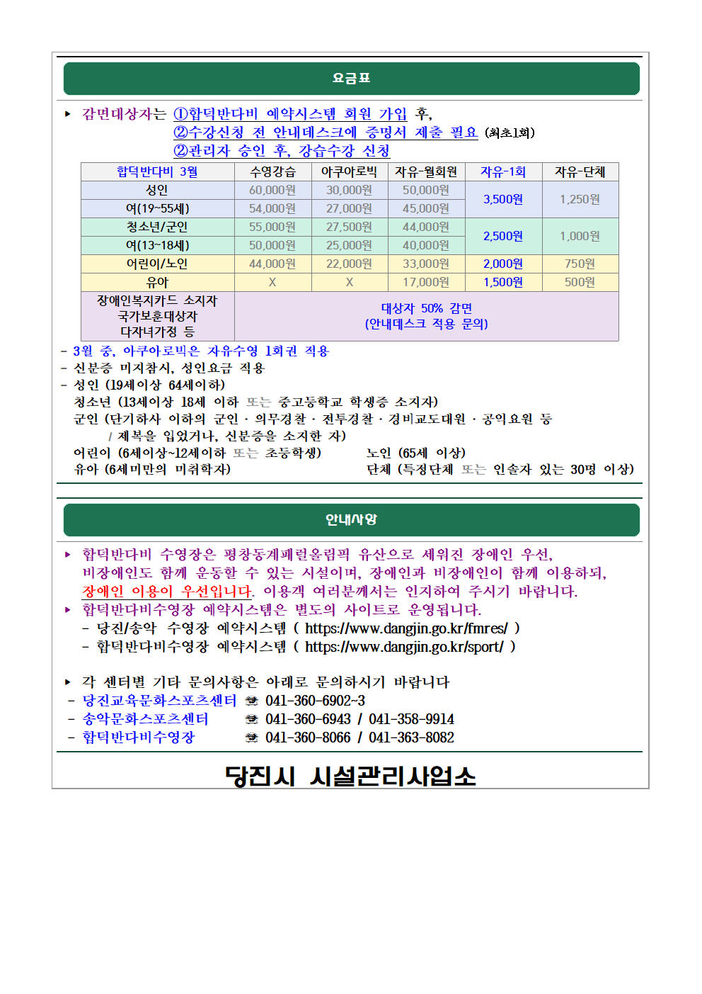 합덕반다비수영장 3월 운영 안내